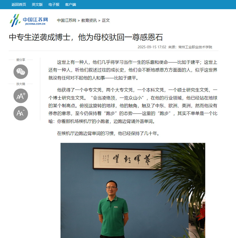 中国江苏网:中专生逆袭成博士,他为母校驮回一尊感恩石