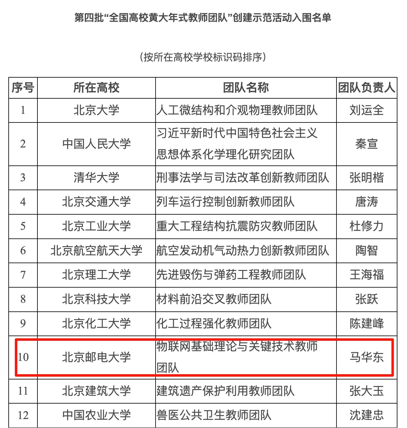 日前,教育部印发通知,公布第四批“全国高校黄大年式教师团队”创建示范活动入围名单,北京邮电大学物联网基础理论与关键技术教师团队入选。