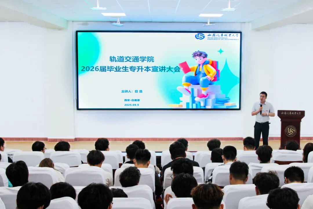 为进一步做好学生学历提升指导与服务,助力专科生实现本科求学梦想,2025年9月9日20:00,西安汽车职业大学轨道交通学院在白鹿原校区报告厅召开2026届专科毕业生专升本动员大会。轨道交通学院院长王雷、白鹿原校区学管组长武敏,学校招生办公室培训科科长巨浩、学院辅导员及2026届全体专科毕业生共同参会。大会由武敏主持。