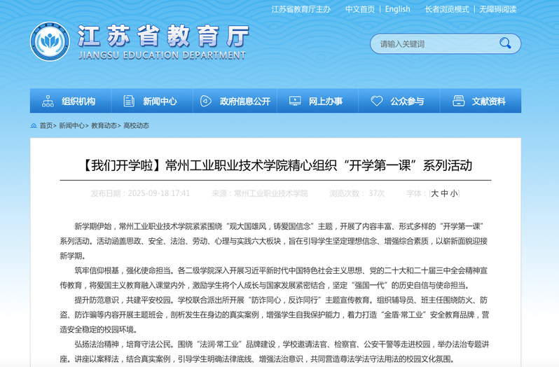 江苏省教育厅:【我们开学啦】常州工业职业技术学院精心组织“开学第一课”系列活动