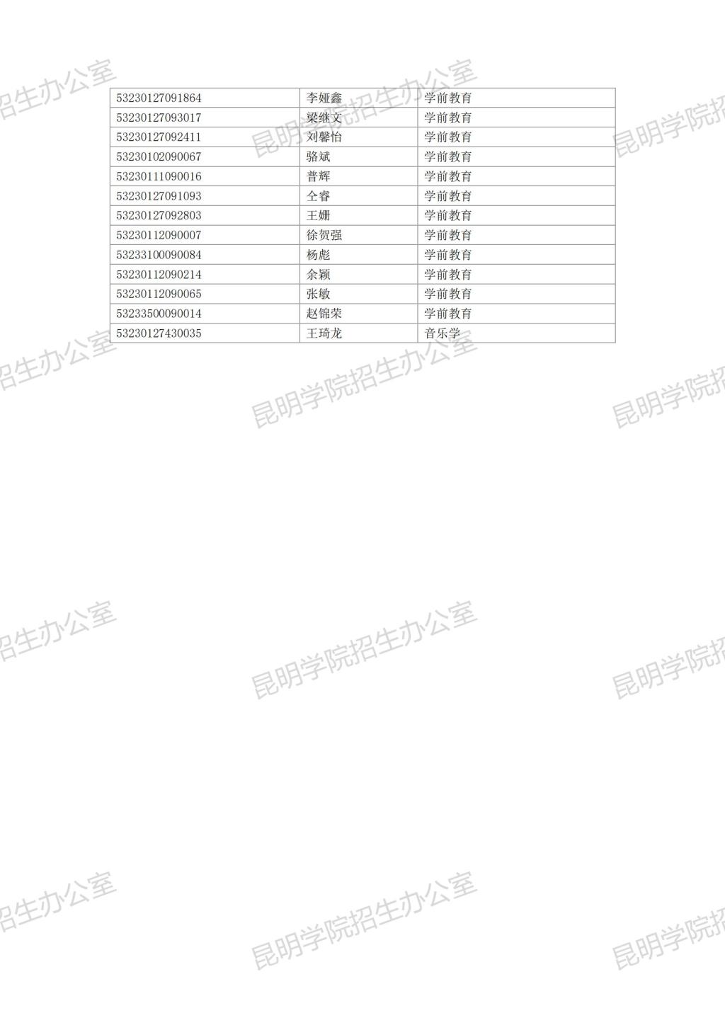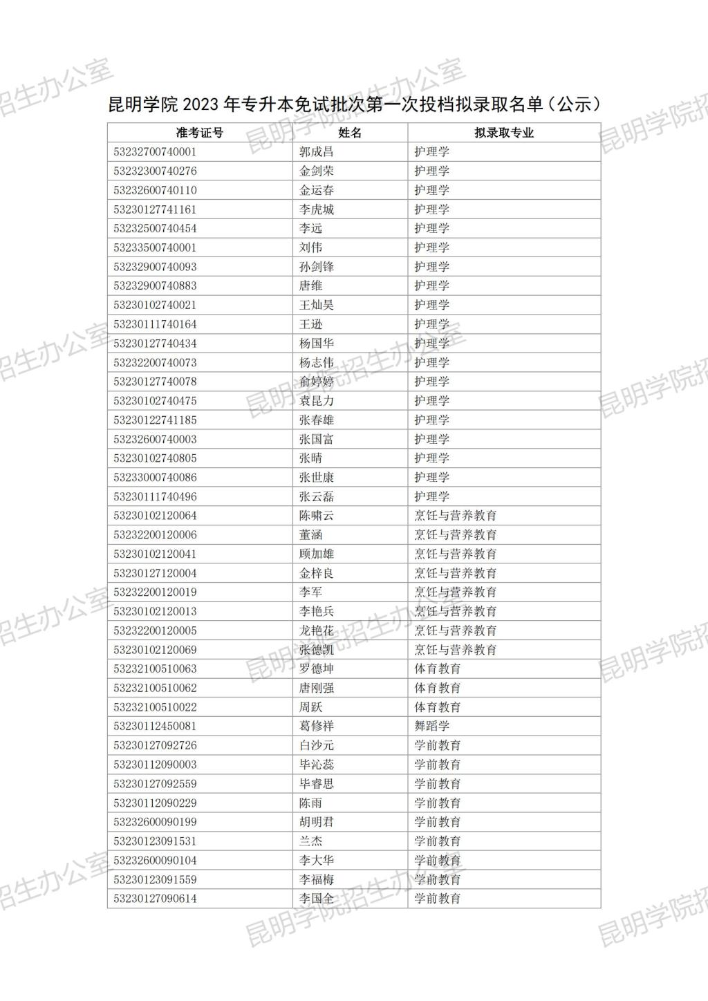 昆明学院2023年专升本免试批次第一次投档拟录取名单(公示)