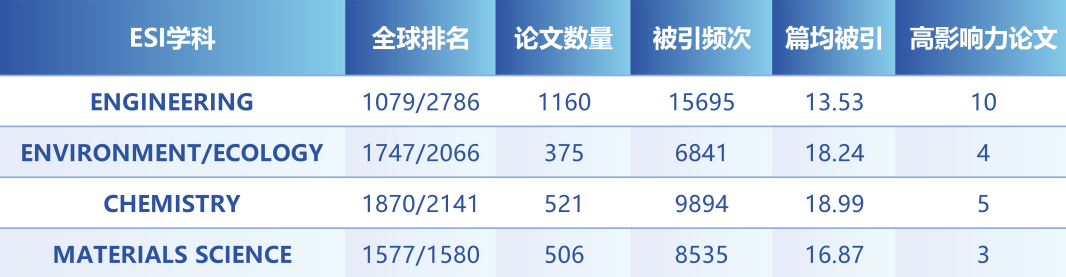 根据总被引频次最新数据,学校总体ESI国际排名较去年同期上升了232位,目前已进入ESI前1%的4个学科具体表现如下: