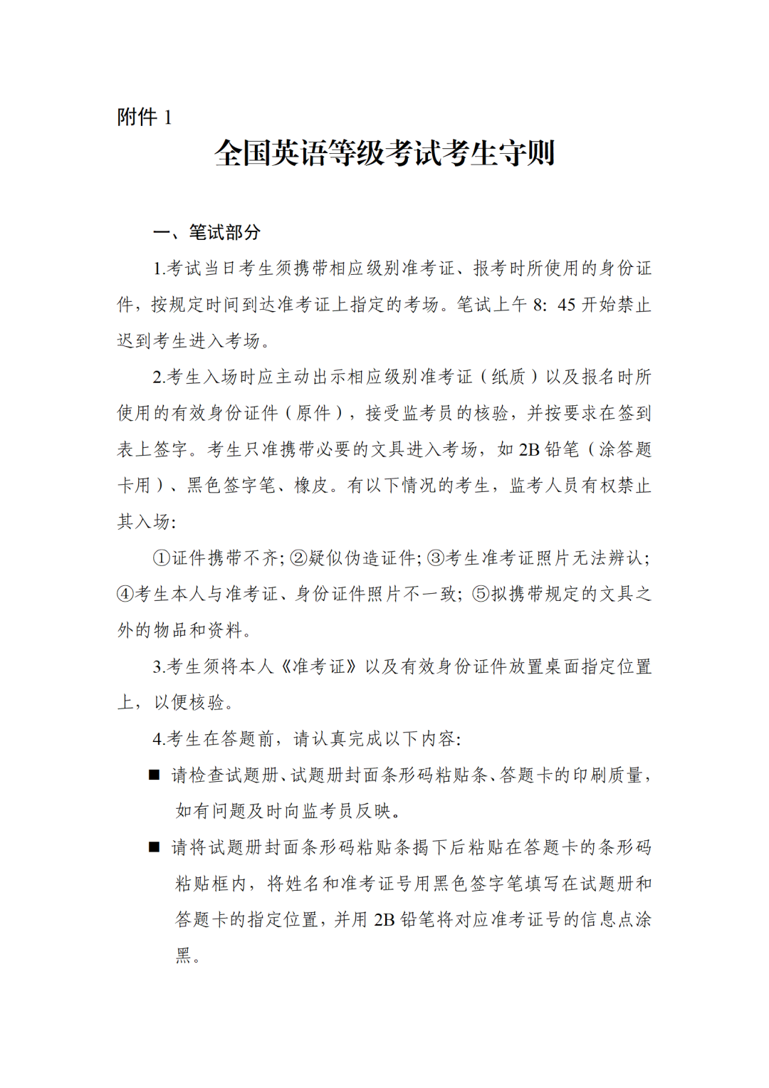 请广大考生严格按照《全国英语等级考试考生守则》(见附件1)、《全国计算机等级考试考生须知》(见附件2),遵守考场纪律,不提前作答,不延后交卷,不影响考场秩序,诚信赴考,切勿发生违规作弊行为。预祝各位考生考试顺利,取得好成绩!