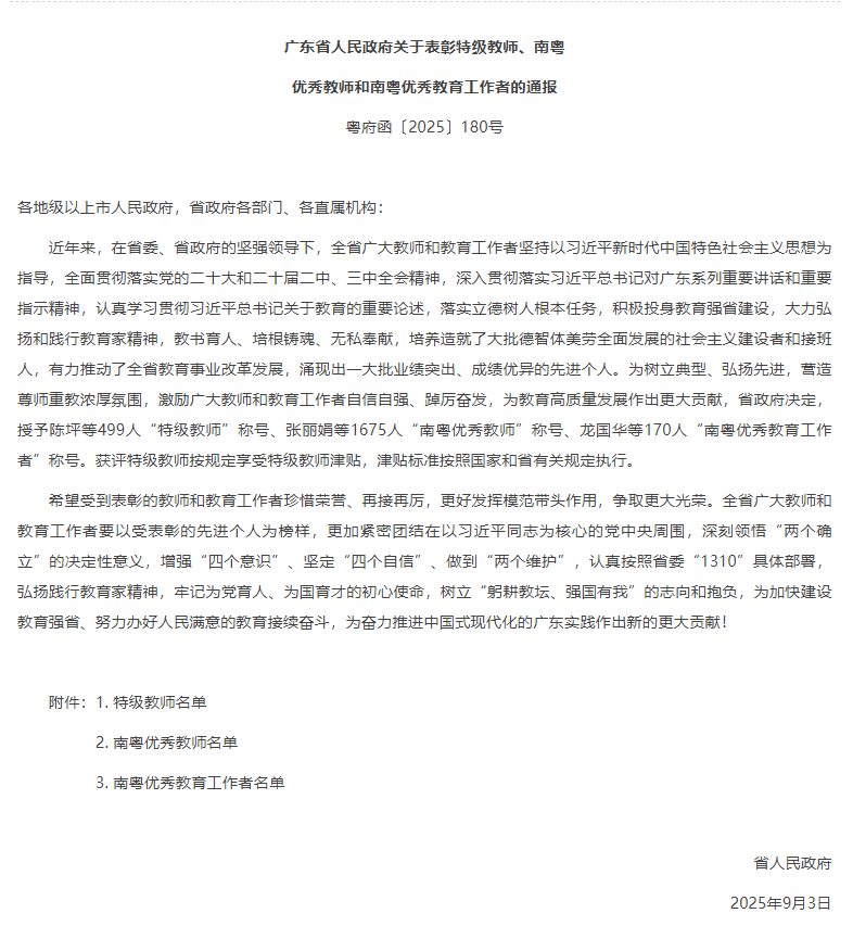 广东省人民政府关于表彰特级教师、南粤优秀教师和南粤优秀教育工作者的通报