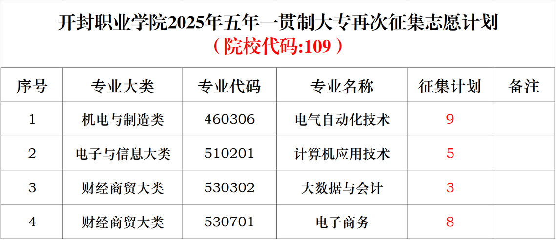 我校2025年五年一贯制大专按程序投档录取后,招生计划仍有余额,现面向符合条件的考生再次征集志愿,有关事宜通知如下: