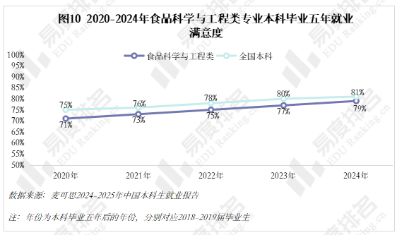 食品科学与工程类专业本科毕业五年就业满意度始终低于全国本科平均水平,差距为2%-4%,2024年差距有所收窄。