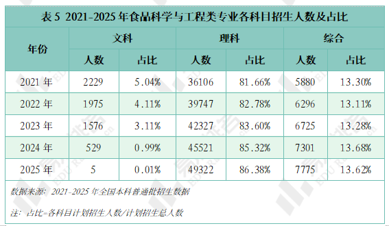近五年食品科学与工程类专业招收文科\历史考生的计划数逐年递减,至2025年已降至个位数,文科生报考食品科学与工程类专业的机会已经接近于0。理科、综合科目的招生人数则在不断增长。