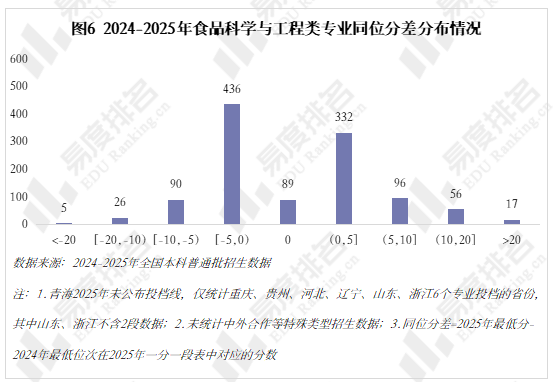 分数下降、上涨的专业占比分别约为49%、44%,整体来看食品科学与工程类录取分数小幅下降。从下降幅度看,15%的专业上涨超过5分,集中在重点及其他院校,11%的专业下降超过5分,985、211、双一流院校占比明显高于前者。可见高层次院校即便是缩招也难以挽救降分现实,普通院校反而可通过特色化教学拉升好感度。
