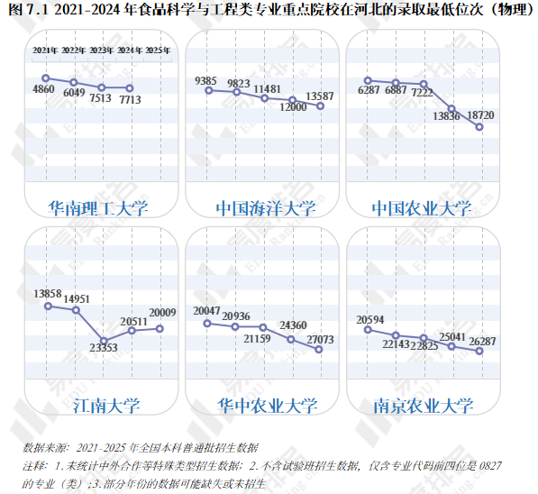 以河北省为例,食品科学与工程类专业排名靠前的六所高校历年录取位次整体稳健但暗藏危机。
