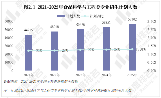 食品科学与工程类专业招生计划人数及占全国本科总计划的比例自2021年开始逐年增加。