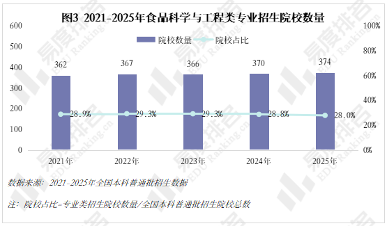 与专业点数量增长趋势一致,食品科学与工程类专业招生院校数量也在逐年增加,几乎每年都有4-5所院校新开设该专业类,仅在2023年下降1所。但其增速不及全国本科招生院校增长速度,院校占比在2023年达到峰值后回落。