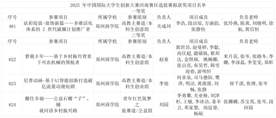 近日,河南省教育厅正式公布中国国际大学生创新大赛(2025)河南赛区选拔赛结果。我校参赛团队在该项高水平赛事中共4个项目荣获省级奖项,其中一等奖1项、三等奖3项。