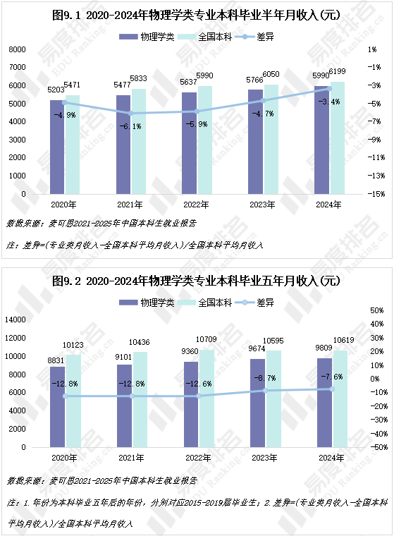 然而跟高就业率相反,物理学类毕业生的起薪持续低于全国本科平均水平。从毕业生五年后来看,差距正在稳步缩小,从2021年的-6.1%收窄至2024年的-3.4%。随着更多物理毕业生进入高薪的交叉领域,其长期差异或将会越来越窄。