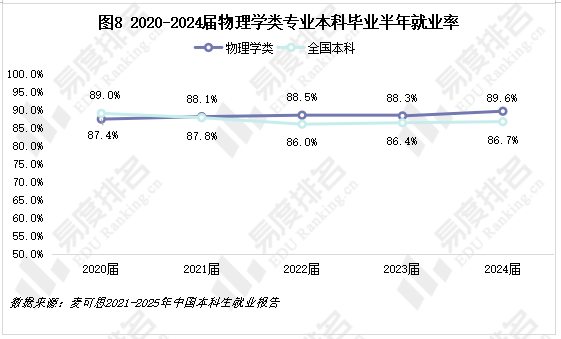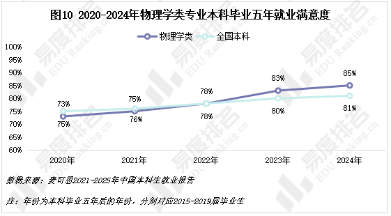 就业率和薪资水平的稳步提升,有效带动了就业满意度的增长。物理学类专业毕业生在毕业五年后的满意度呈现持续向好趋势,2022年已与全国平均水平基本持平,至2024年更是较全国平均满意度高出4%。