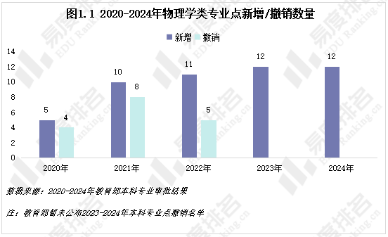 物理学类专业点新增数量从2020年的5个稳步上升至近三年的年均12个左右。整体规模扩张速度明显放缓,进入稳定期,但社会对高水平物理人才的需求仍在。