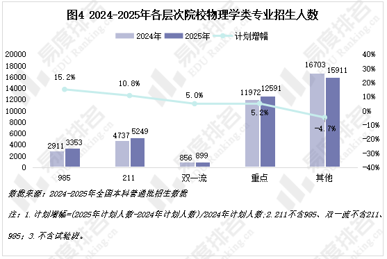 今年985和211高校的招生人数增幅最大,物理学类专业招生计划增幅均超10%。与此相对,其他院校的招生计划减少了4.7%。优质教育资源会进一步向顶尖高校集中,毕业生在深造和进入高端科研领域优势将更明显,不同层次院校的毕业生在深造路径和就业出口上可能会产生更明显的分化。