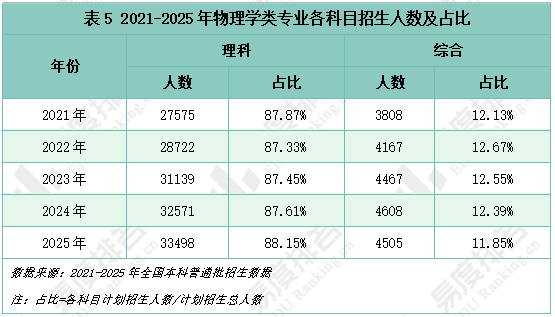 2025年物理学类专业招收理科/物理考生的计划数进一步扩大,综合科目的招生人数占比则从2022年开始持续下降,今年已降至12%以下。