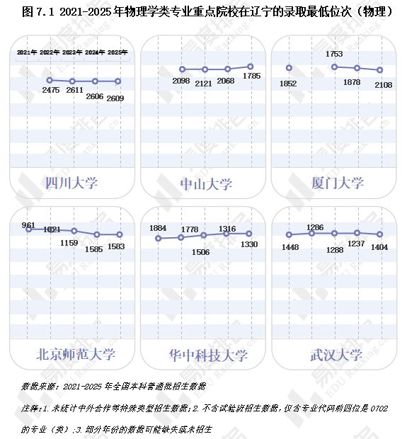 下图展示了部分985高校物理学类专业在辽宁的录取情况。由于2025年物理学类专业招生计划增幅显著,尤以985/211高校为主。多数顶尖院校因供给增加,录取位次出现温和后移(如华科、武大、厦大),也印证了普遍专业分数下降且幅度有限的情况;然而,部分院校(如中山、北师大)报考热度增幅甚至超越扩招幅度,录取位次逆势提升,是少数专业分数上涨的代表。