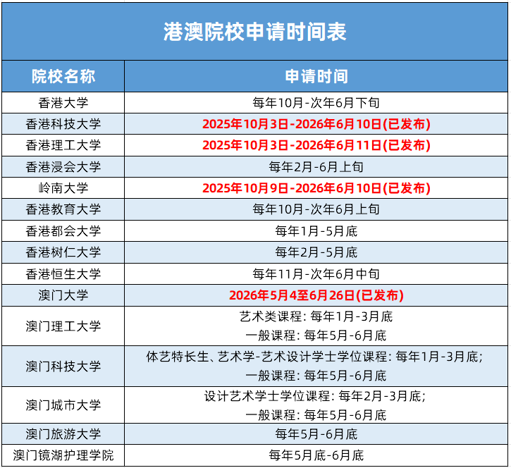 港澳高校一般在每年10月到次年6月进行申请,小编整理了重点港澳院校申请日期,供2026届及低年级考生家长参考,考生要密切关注申请时间,合理安排报考计划。