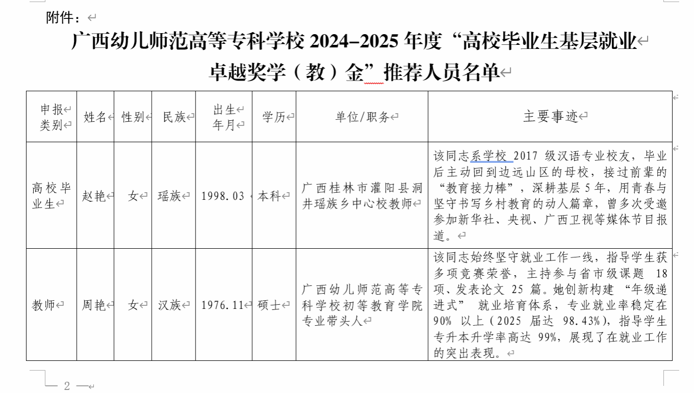 附件:广西幼儿师范高等专科学校2024-2025年度“高校毕业生基层就业卓越奖学(教)金”推荐人员名单