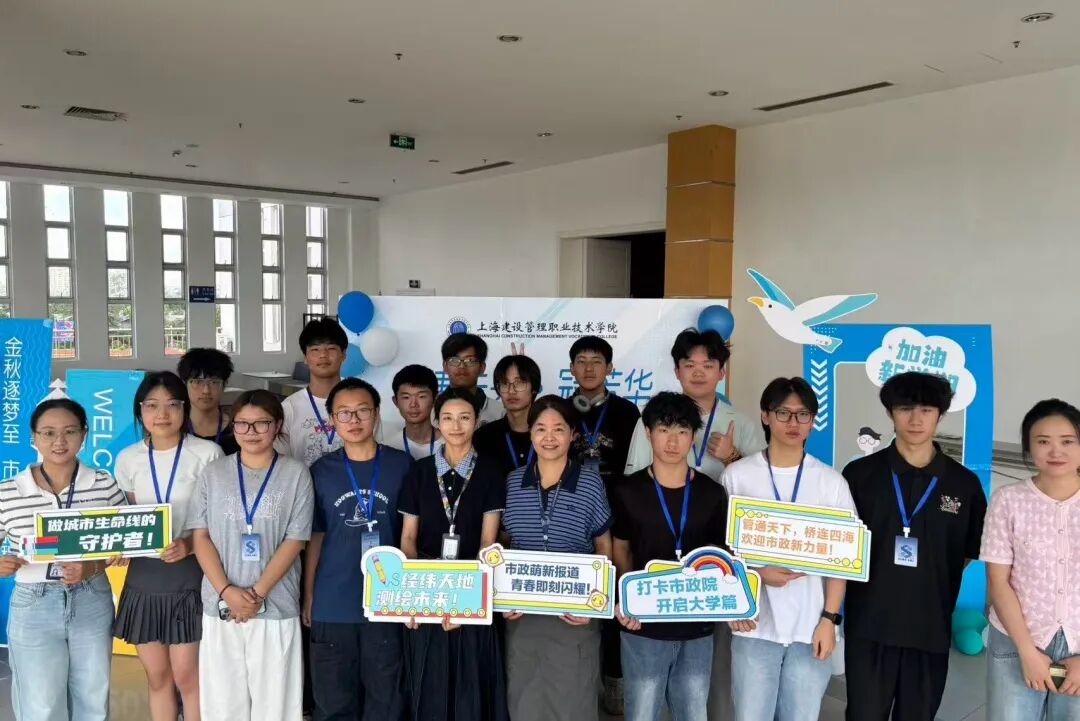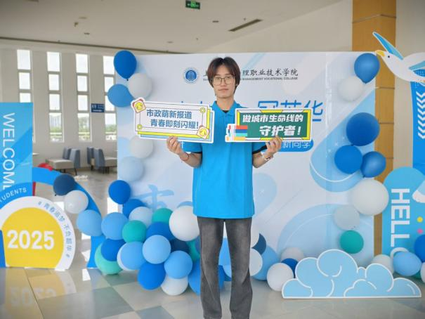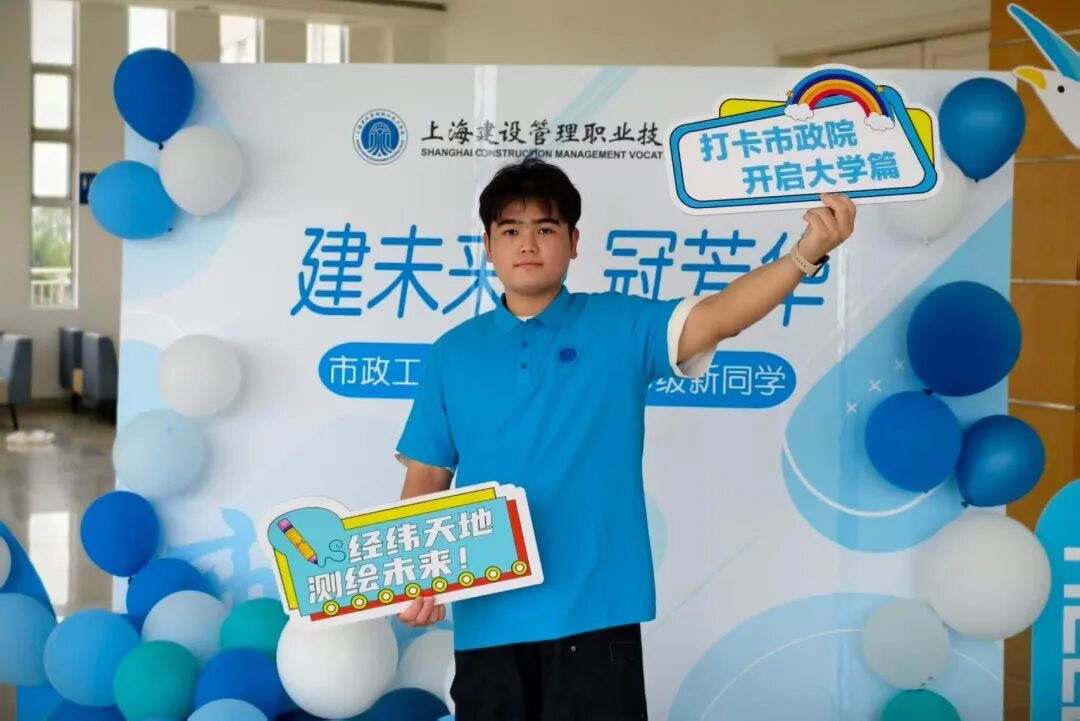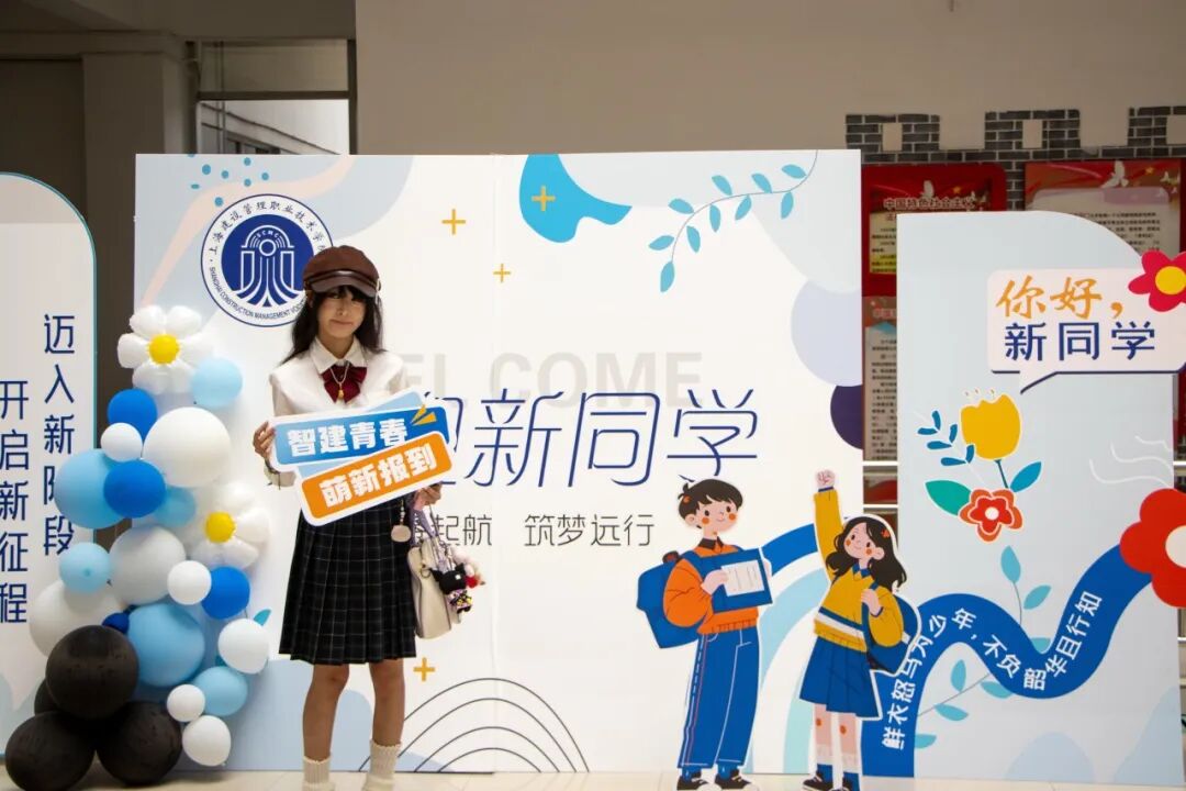 拍照打卡区布置精巧,“筑梦智建,启航未来——点亮智能建筑新星空”主题背景前,新生们定格青春笑脸,留下与学院的初遇记忆。