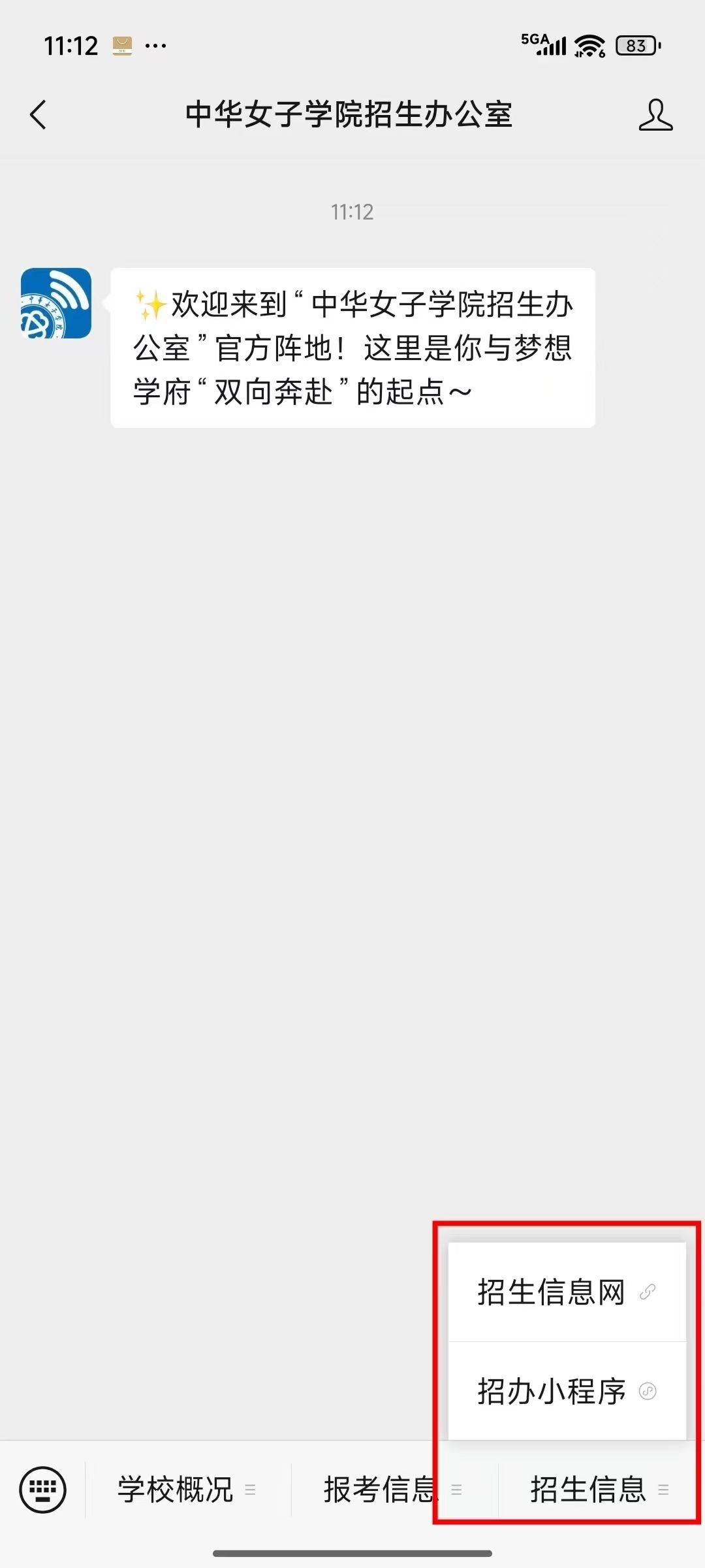 关注“中华女子学院招生办公室”微信公众号,查看录取进程。通过右下角导航栏,登录招办小程序,查询录取信息。