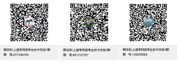 2.报名方式:本次考试报名提供集体报名和网上报名两种方式。集体报名是由考点通过网上报名系统统一为考生进行报名,网上报名则需考生个人登录网上报名系统(https://scite.shmeea.edu.cn)完成报名流程。报名期间遇到技术问题可加入以下任一QQ技术支持群咨询:637548290、691252597和148609884(任选其一即可,问题解决后请主动退出),对应二维码如下图所示: