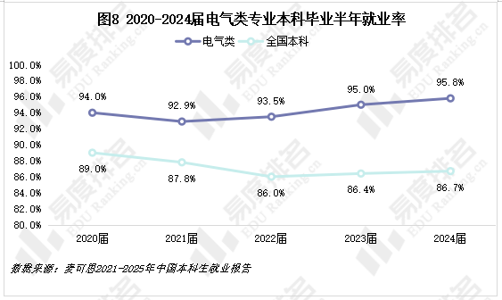 电气类专业不仅是热门,更是一个能经受经济波动考验、提供极高就业确定性的压舱石型专业。其就业率不仅常年大幅领先全国本科平均水平,并且领先优势还在持续扩大。近两届就业率连续突破95%,电气专业的就业市场正处于景气周期的高点,社会需要电气人才,而且越来越需要。强大的就业韧性和独特的市场竞争力让其就业率在所有专业类中排名第二。