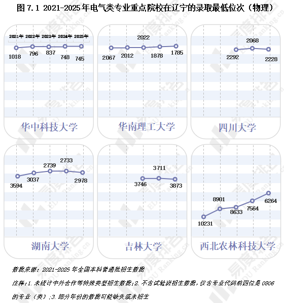 下图展示了部分985院校电气学类专业(物理)在辽宁的录取情况。电气类顶尖985院校的热度有增无减。华南理工和西北农林科技大学门槛直接提升,热度增长势头非常强劲;华中科大作为传统“电气四虎”之一门槛坚如磐石;川大、湖大、吉大2025年因扩招带来小幅回落,其报考绝对热度仍在高位运行。在扩招背景下,头部985院校电气类专业并未降温,竞争都在变得更加激烈。