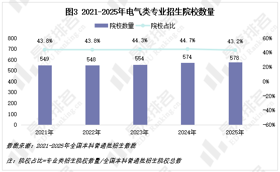 开设电气类专业的院校占比稳定在43%-45%之间。开设电气专业并非易事。需要强大的物理、数学师资、昂贵的实验设备等。较高的准入门槛阻止了大量不具备条件的院校盲目开设此专业。2025年占比回落至43.2%,可能意味着同期全国院校总数有所增加,而其中新增的院校大多不具备开设电气专业的条件。