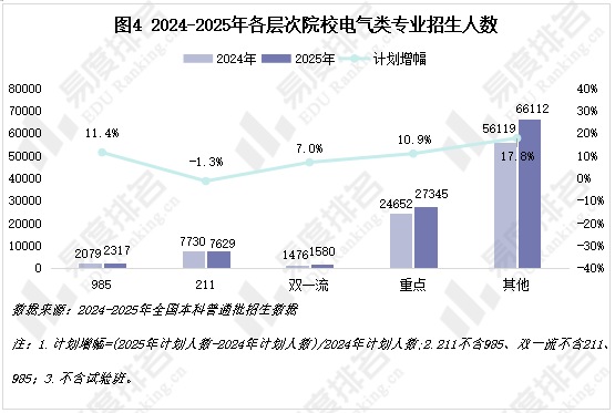 今年除了211高校以外各层次招生人数均有增长。其他院校扩招幅度最大,市场对于应用型人才需求旺盛,这为更多考生提供了攻读电气专业的机会,但毕业生也将面临更激烈的同层次竞争。985院校增幅达到11.4%,扩招比例不低,但绝对数量增加不多,头部院校培养重点不是规模扩张,而聚焦于国家战略需求的尖端领域,如智能电网、能源互联网、新型储能等。
