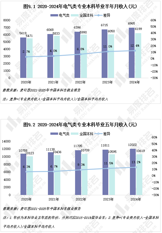 电气类专业不仅拥有高于平均水平的起薪,更具备卓越的薪资成长性和职业发展天花板。其收入优势并非昙花一现,而是随着工作年限增加而持续扩大,是一项兼具短期确定性与长期高回报的优质教育投资。毕业五年后,电气类专业毕业生的平均月收入轻松突破1.2万元,相比其半年的收入几乎实现翻倍;薪资差异也从6.3%显著扩大至13.2%。