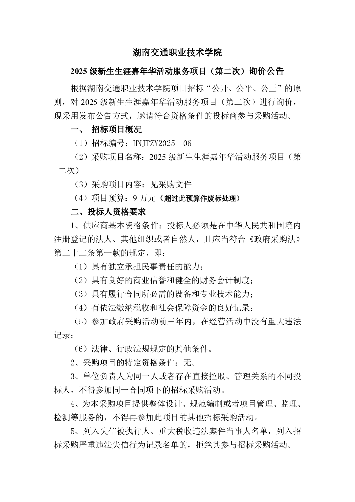 学院2025级新生生涯嘉年华活动服务项目(第二次)询价公告