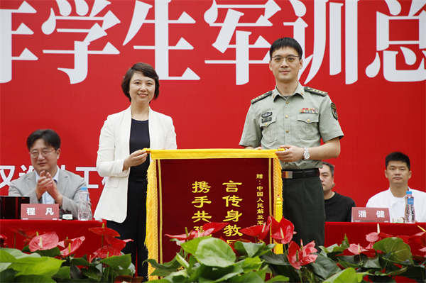 大会上,王长华代表学校向中国人民解放军信息支援部队工程大学赠送锦旗,对承训单位在军训工作及国防教育方面给予我校的大力支持表示诚挚感谢。