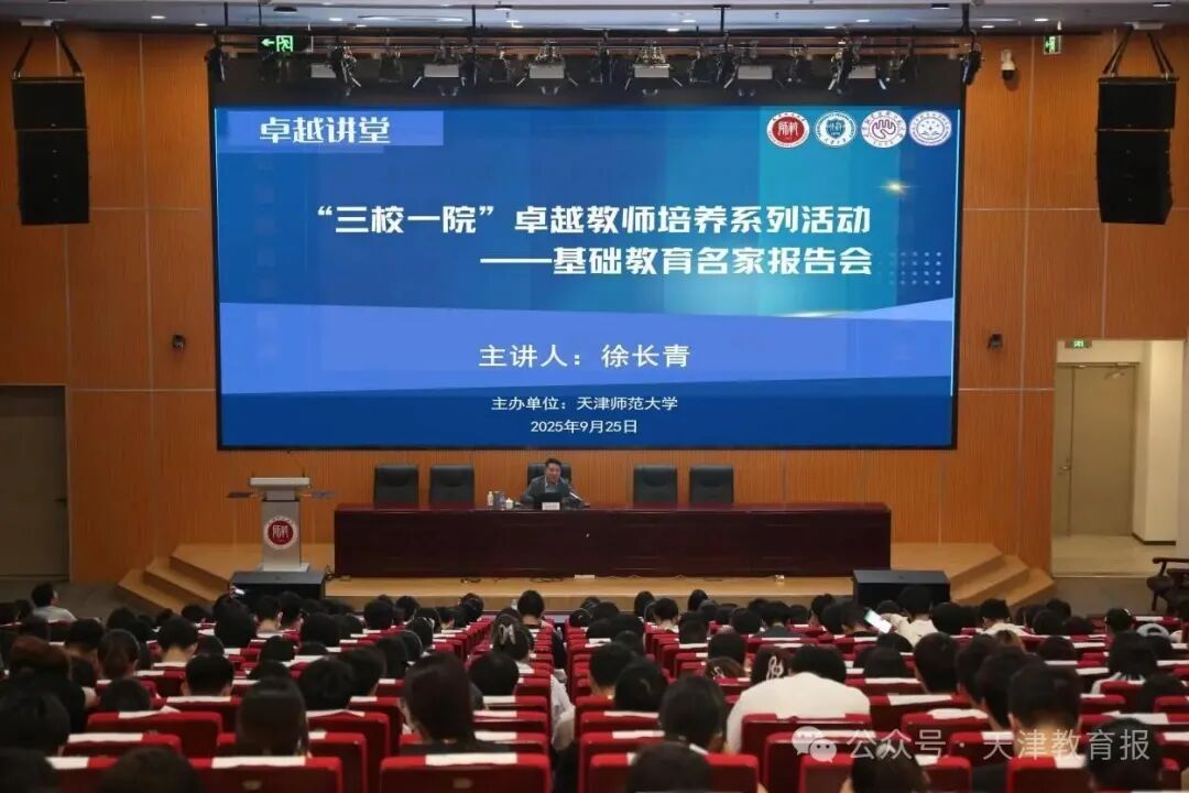 9月25日,“三校一院”卓越教师培养系列活动——基础教育名家报告会在天津师范大学举行。报告会特邀全国著名教育专家、天津市红桥区教师发展中心副主任徐长青作专题报告,主题聚焦“弘扬教育家精神,做新时代大先生”。主会场设在天津师范大学,天津大学、天津职业技术师范大学设立分会场,线上线下共有近800名师范生参加,天津市部分中小学教师通过继续教育平台同步观看。