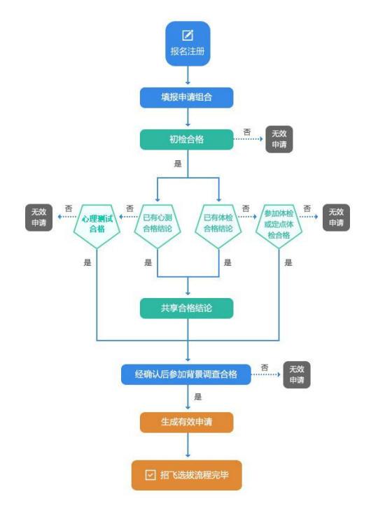 为帮助您在招飞选拔过程中节约时间和费用,便于您更好地备考,同时让您有机会在更多的合格申请组合中选择确认有效招飞申请,系统对部分环节的结论在特定情况下设定了结论共享。请注意,这里的结论共享特指申请组合之间共享。