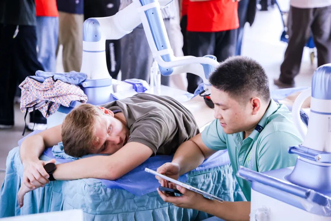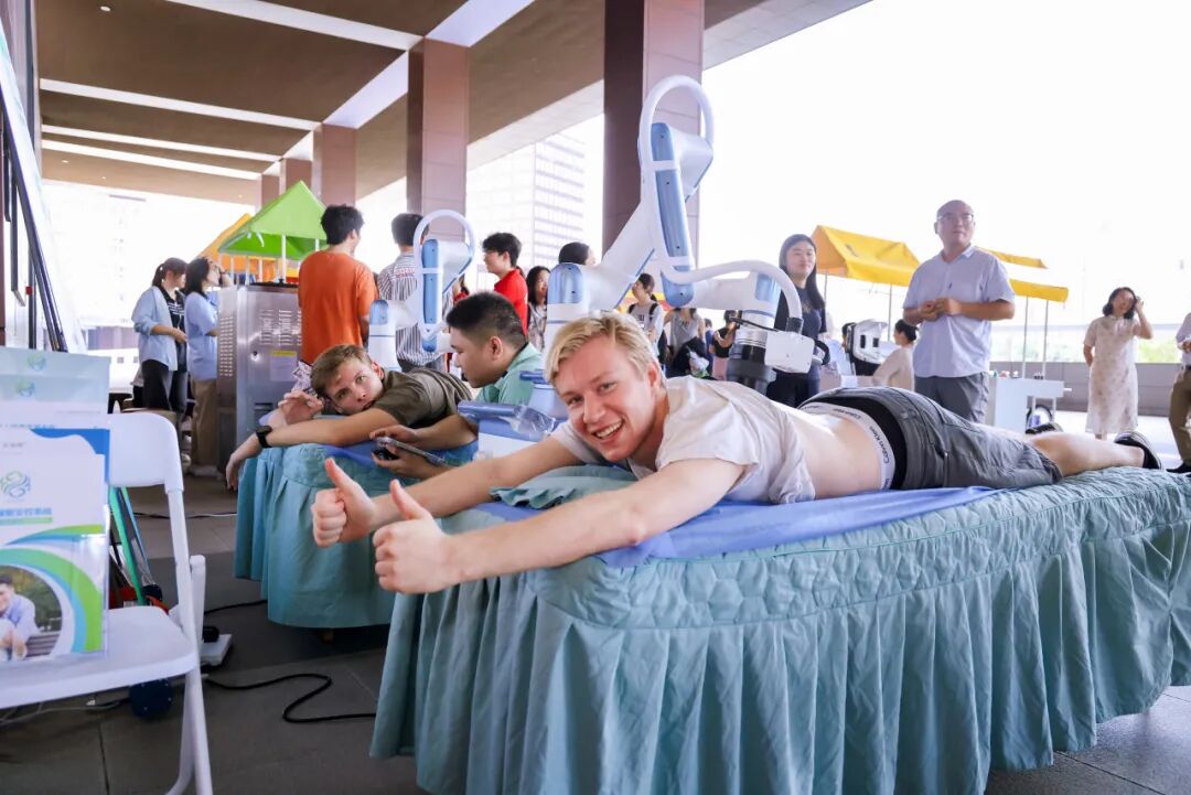 来自德国纽伦堡应用技术大学的Simon Kühnlein和Lucas Gillert现场体验了AI按摩机器人,体验结束后,两人难掩惊喜与认可,连连称赞这款设备“体验感远超预期”。