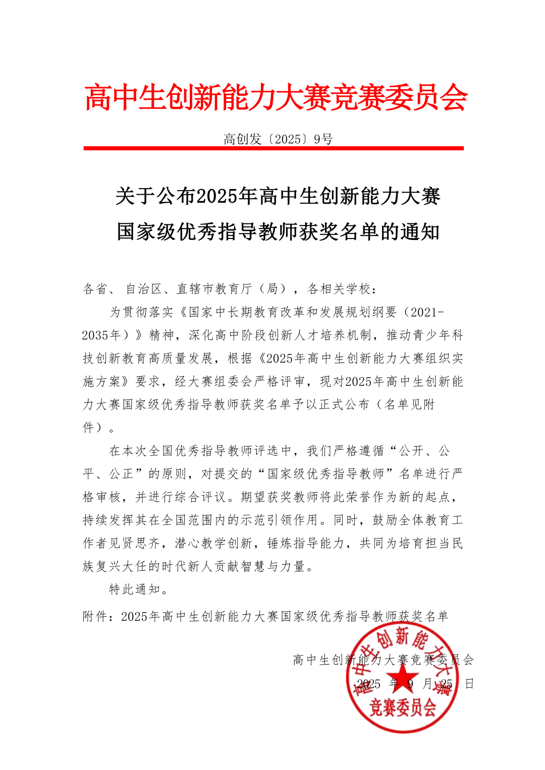 关于公布2025年高中生创新能力大赛国家级优秀指导教师获奖名单的通知