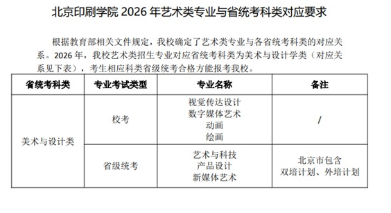 北京印刷学院2026年艺术类专业与省统考科类对应要求