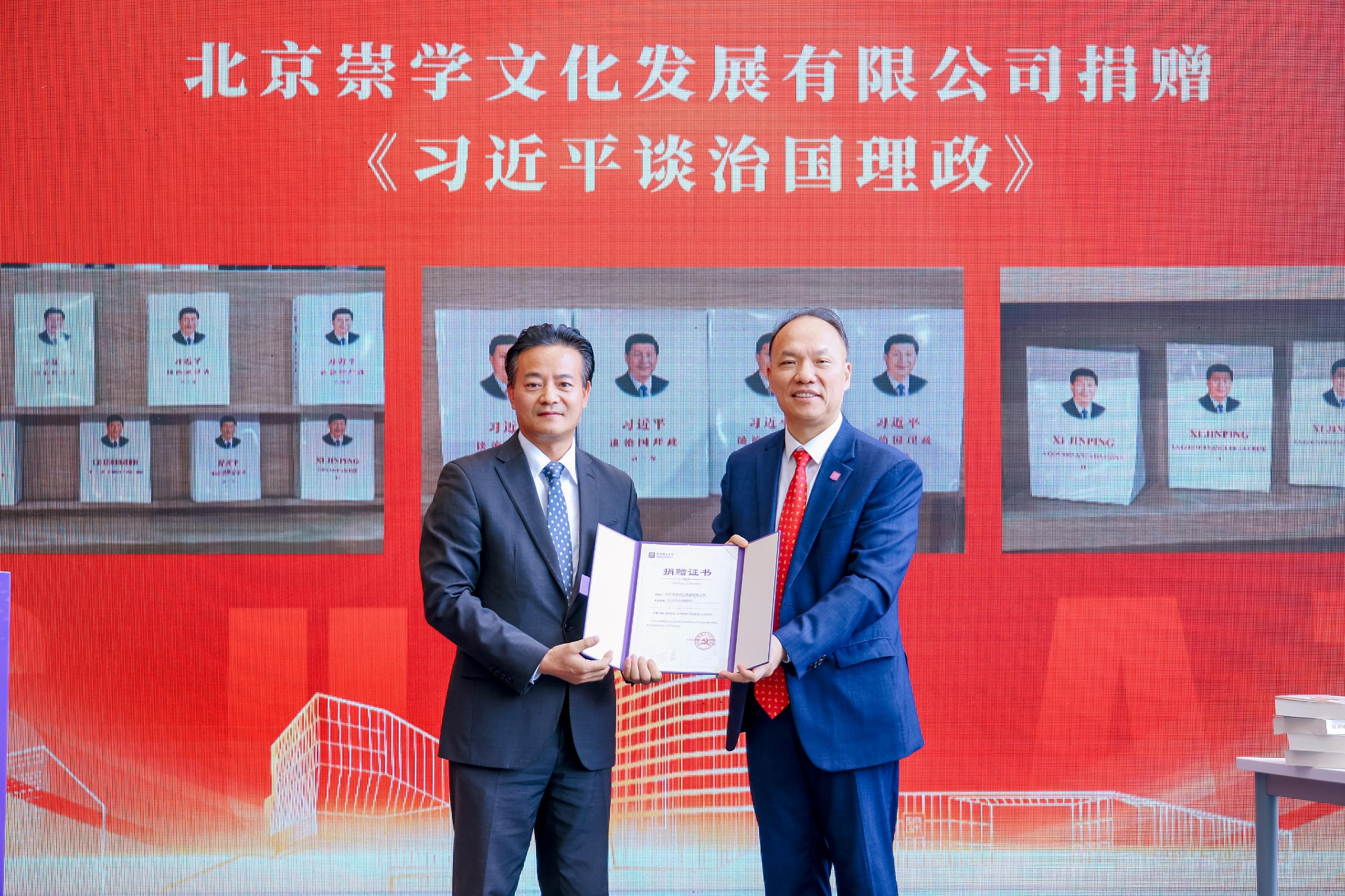 捐赠仪式上,朱迪俭书记向余富文颁发捐赠证书,对北京崇学文化发展有限公司给我校捐赠《习近平谈治国理政》多语种图书表示感谢。