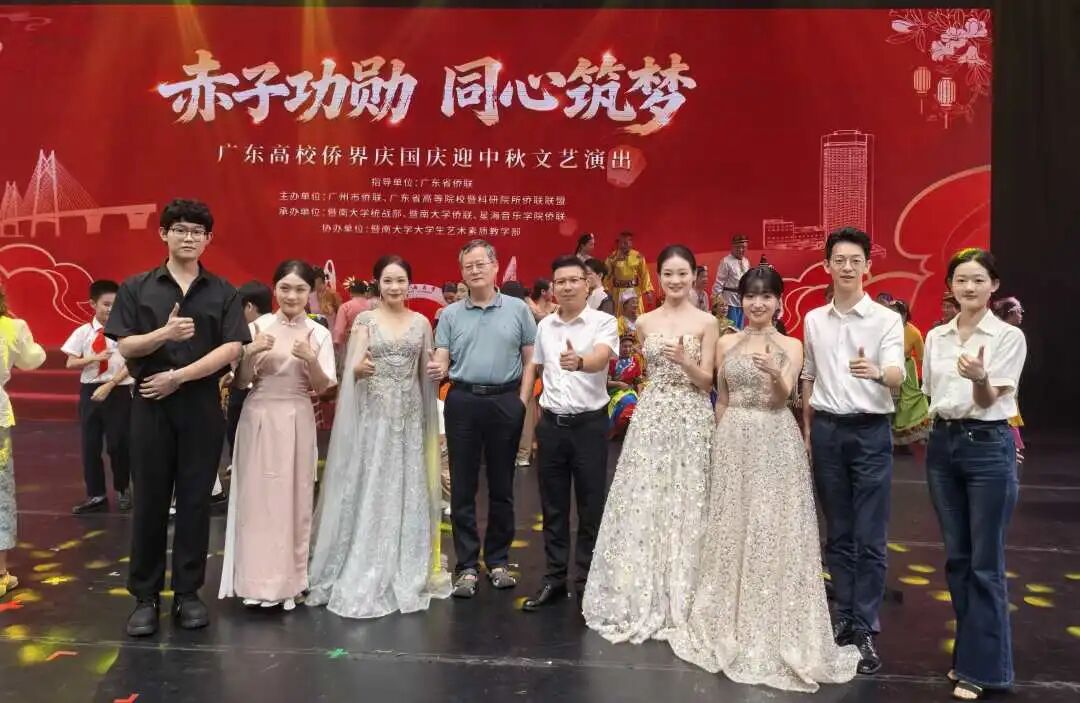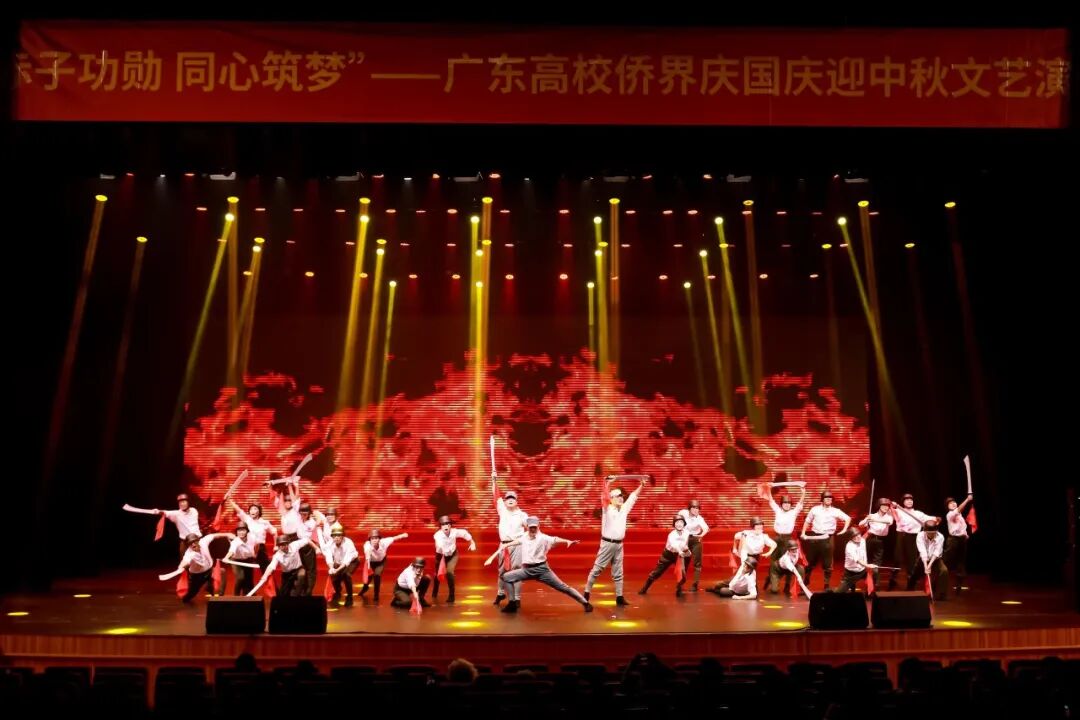 为纪念中国人民抗日战争暨世界反法西斯战争胜利80周年,庆祝中华人民共和国成立76周年、喜迎中秋佳节,9月26日,广东高校侨界“赤子功勋 同心铸梦”庆国庆迎中秋主题文艺汇演在暨南大学石牌校区举行。来自中山大学、暨南大学、星海音乐学院等9所高校的侨界师生齐聚一堂,以文艺表演共抒家国情怀。广州软件学院基础与通识教育学院原创作品《广软之歌》受邀参演。学校侨联主席吴伟生、基础与通识教育学院院长苏峰等出席活动。