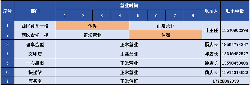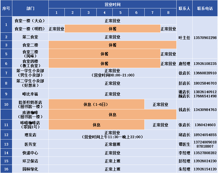 2.假期小卖部、啡比幸福、理发店、医务室、快递中心、环卫保洁、园林绿化和热水系统正常服务。