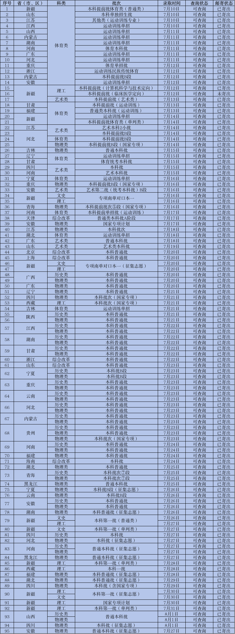 录取进程及结果查询方式公布如下