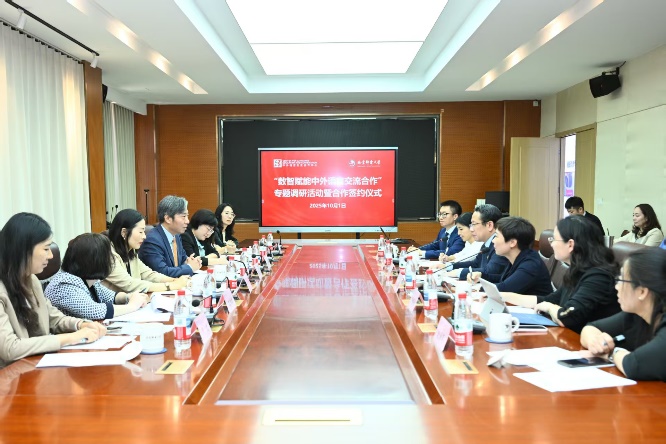 座谈交流环节,学校国际合作与交流处和人文学院主要负责人分别汇报了学校国际交流合作和数智赋能语言教育发展有关情况。