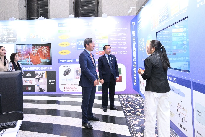 会前,郁云峰一行参观调研了学校“文化资源大数据服务技术集成与典型应用”项目成果展。