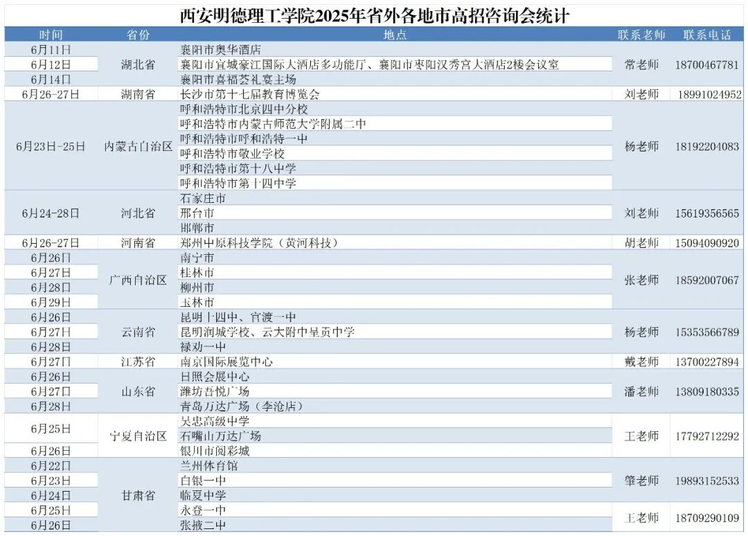 高考出分在即,为帮助2025年高考考生及家长充分了解我校招生情况、理性填报志愿,现将我校2025年参加全国各省招生咨询会行程公布如下: