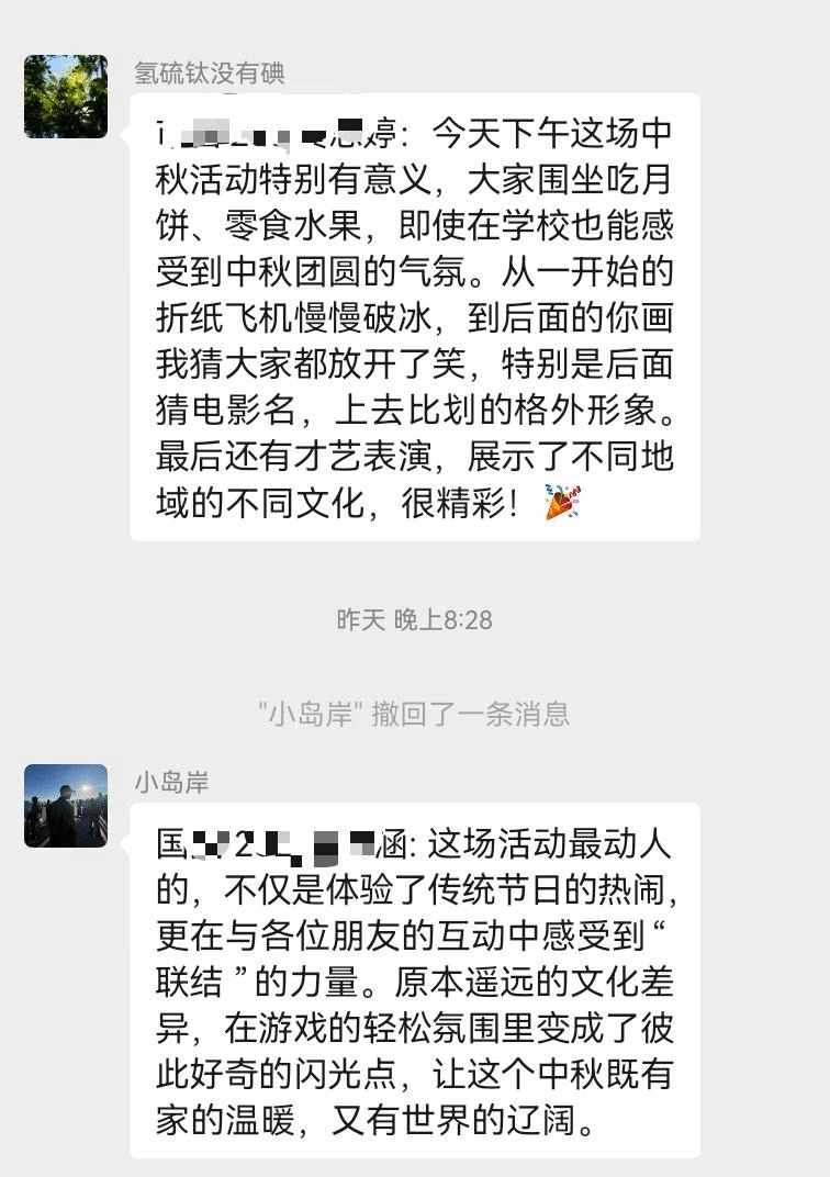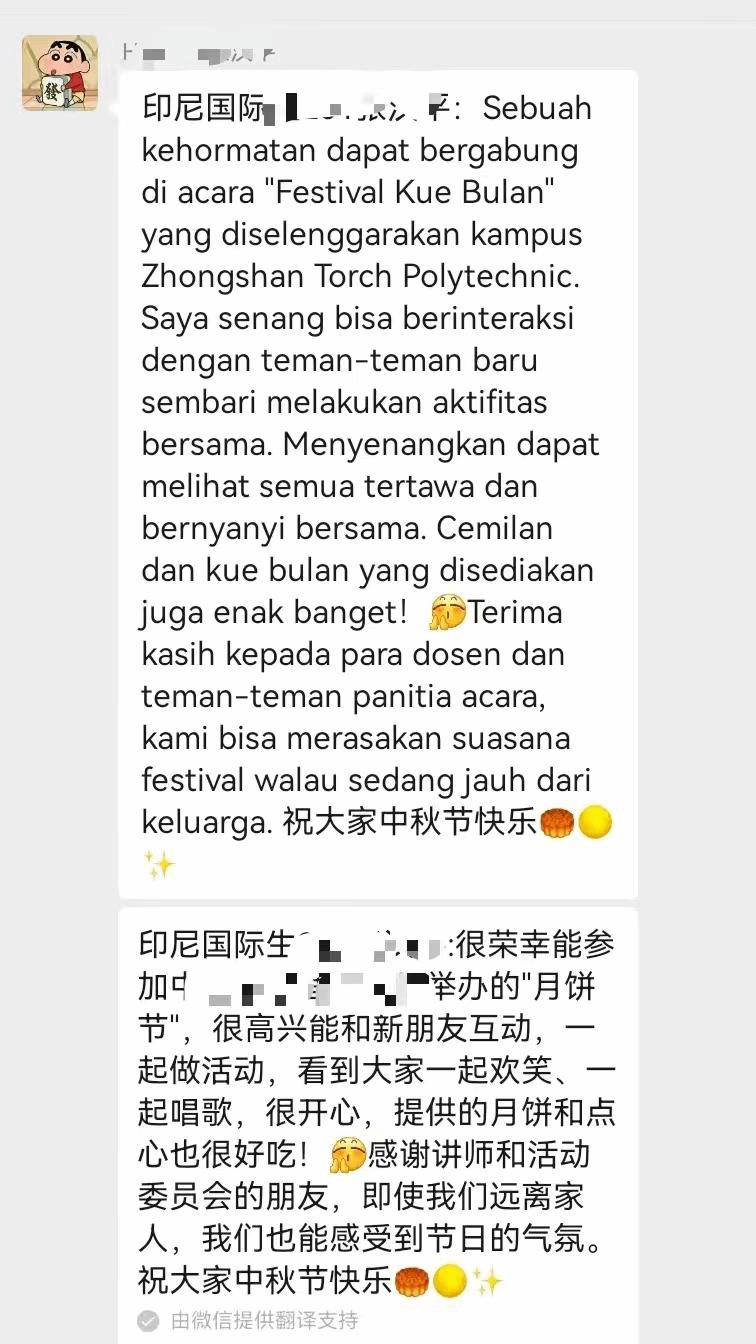 活动接近尾声时,全体师生手持自制灯笼分享感受。来自印度尼西亚的留学生张同学表示首次在异国他乡过中秋很温暖很欣喜,留校学生、来自云南的曹同学也感慨此次活动驱散了离家求学、在外过中秋的孤单。