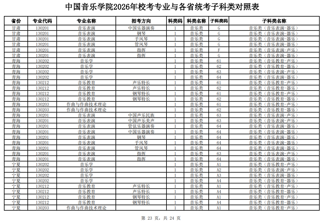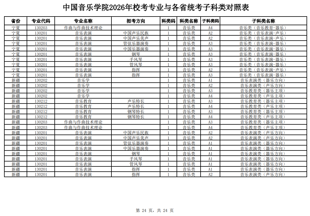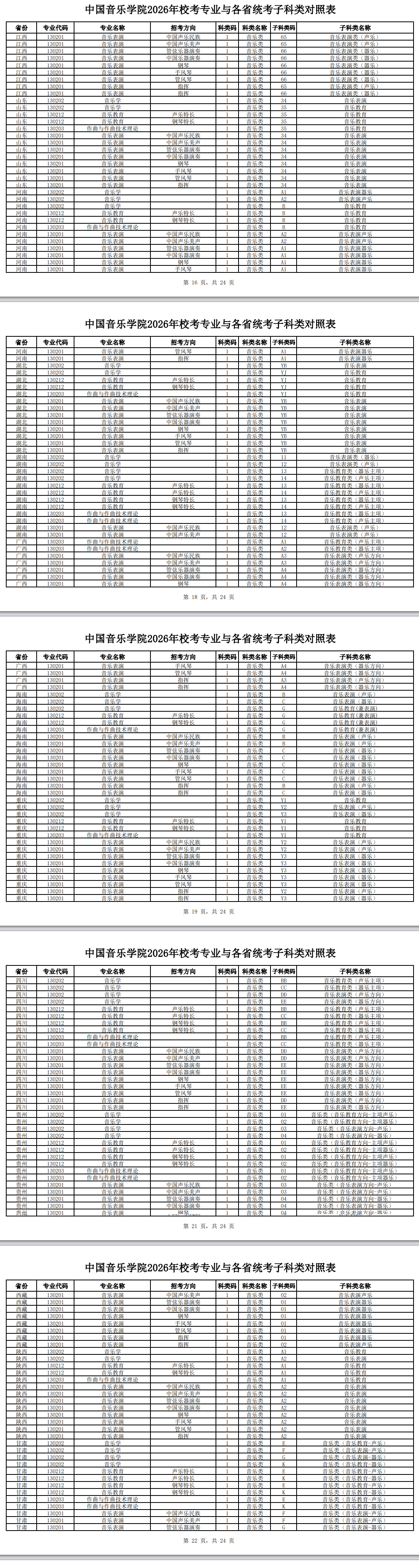 中国音乐学院2026年校考专业与各省统考子科类对照表