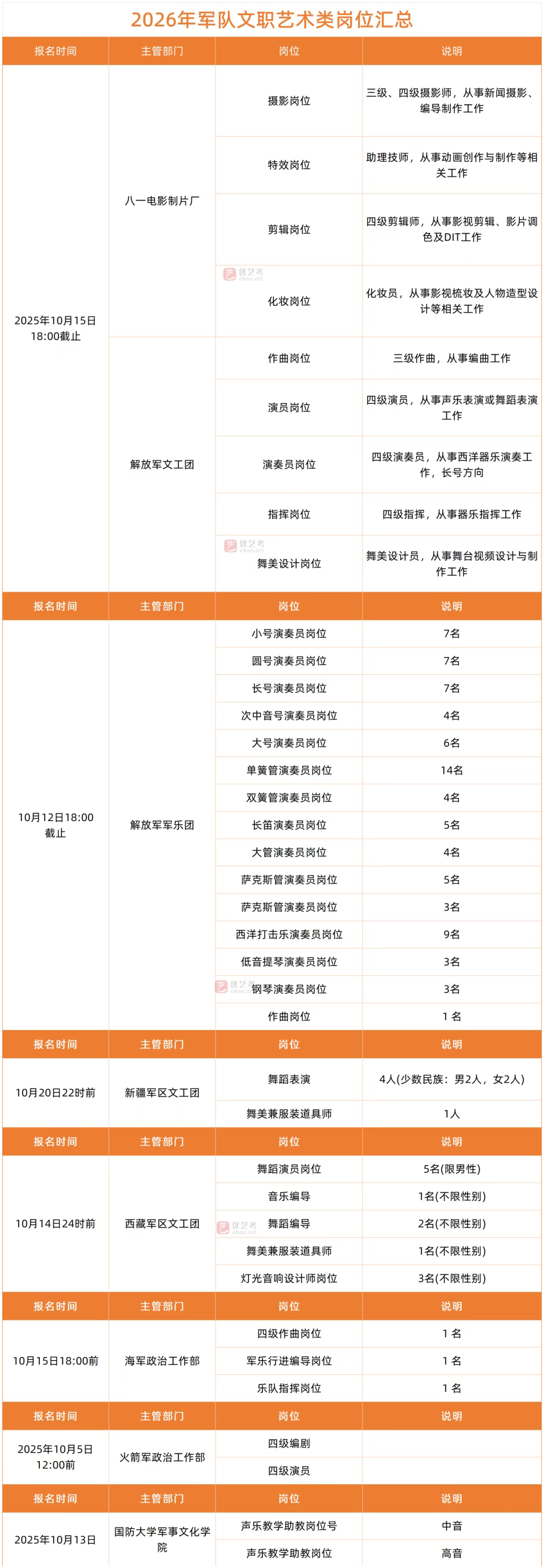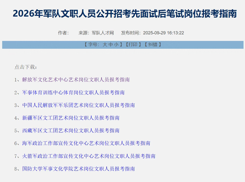 9月29日,军队人才网公布《2026年军队文职人员公开招考先面试后笔试岗位报考指南》,其中包含多个艺术类岗位,一起来看看。