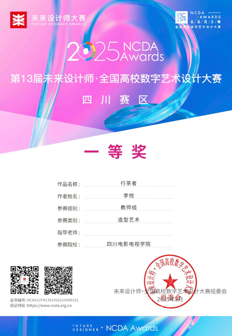 2025年8月,我院李悦老师在2025年第13届未来设计师·全国高校数字艺术设计大赛(四川赛区)中斩获造型艺术类别教师组一等奖!其作品《行茶者》凭借出色的艺术表现力与独特的创作理念,在众多参赛作品中脱颖而出。